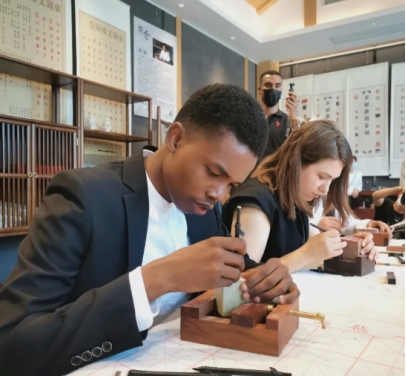 篆刻“乡村振兴”印章的莫桑比克籍莫德,他很兴奋参加这次活动,他说这次活动让他对中国的乡村振兴和中国共产党的伟大成就有了更新的了解,他还说莫桑比克每年面临较大粮食缺口,万宝莫桑农业园项目就是中国的“致富经”扎根莫桑比克的项目,这个项目提高了他们国家当地人的收入水平和解决了粮食缺口的问题。