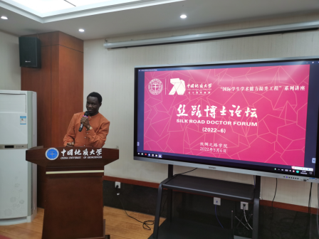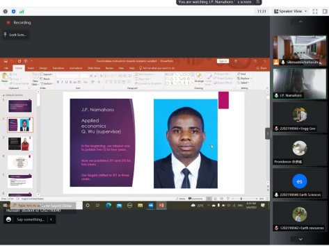 5月6日,2022年第六期丝路博士论坛由卢旺达籍经济管理学院博士研究生JEAN PIERRE NAMAHORO(简安)主讲,坦桑尼亚籍博士研究生 EDWIN ERNEST NYAKILLA 主持,JEAN PIERRE NAMAHORO以《5-Mistakes and Motivations towards Academic Excellence》为主题做论坛。