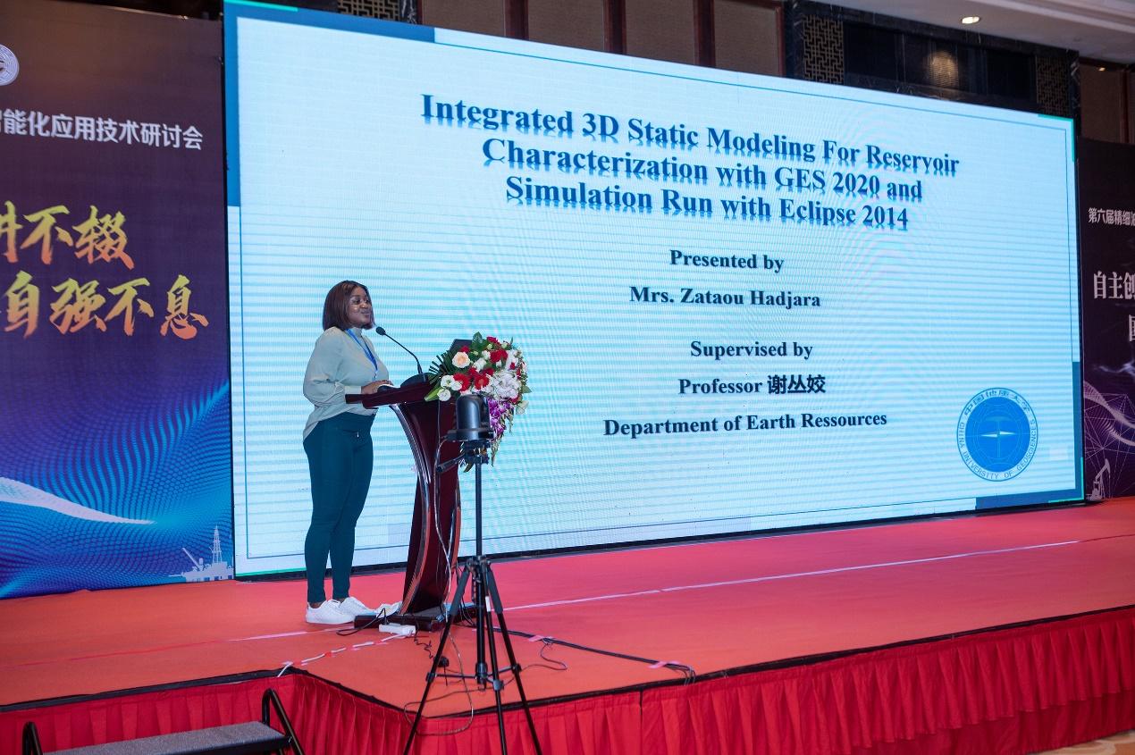 (通讯员 王诲)日前,中国地质大学(武汉)与北京金阳普泰石油技术股份有限公司联合举办的“第六届精细油气藏描述暨智能化应用技术研讨会”在重庆召开。我校资源学院尼日尔籍2021级博士留学生Zataou Hadjara(哈佳娜)应邀在会上做了题为“Integrated 3D Static Modeling For Reservoir Characterization with GES 2020 and Simulation Run with Eclipse 2014”的学术报告,获得了与会代表的一致好评。