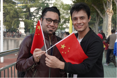 开幕式上,留学生们手持五星红旗、身着各国本民族传统服饰,高举“百年荣光 情缘丝路——我爱地大!我爱中国”的横幅、迈着矫健和自信的步伐、脸上洋溢着自豪的笑容,嘹亮喊出“我爱地大、我爱中国”的口号时,赢得了现场所有观众的热烈掌声。