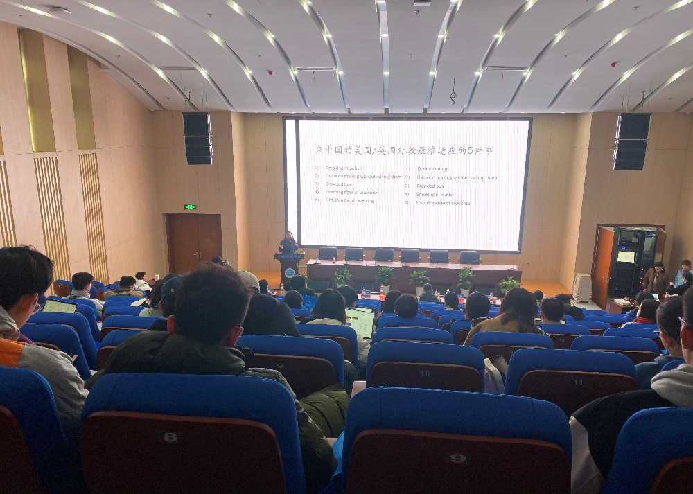 外国语学院杨红燕副院长以《海外留学的跨文化适应》为主题从衣、食、住、行、学等方面讲解中西方差异,希望同学们做中国文化的传播者,在跨文化交流中展现中国思想。