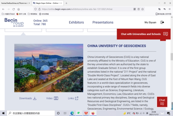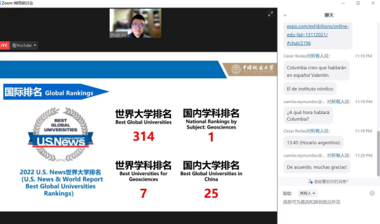 (通讯员 刘小舟 吴凌奇 吴思源) 11月13日,我校参加由德国Begin Group和北京鸿洲教育共同举办的2021年“一带一路”国际教育交流合作第三届线上国际教育展南美洲专场,通过线上方式介绍学校信息、展示地大风采、提升学校国际知名度,拓展南美洲国家优秀国际学生生源。