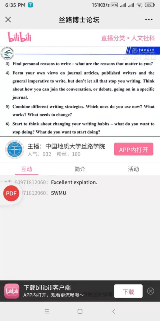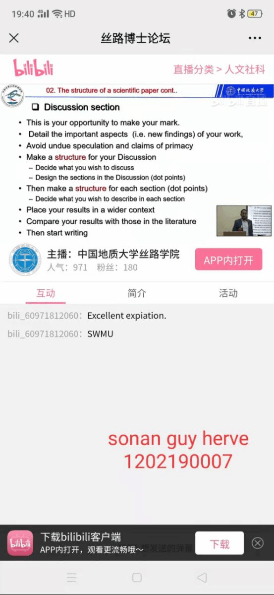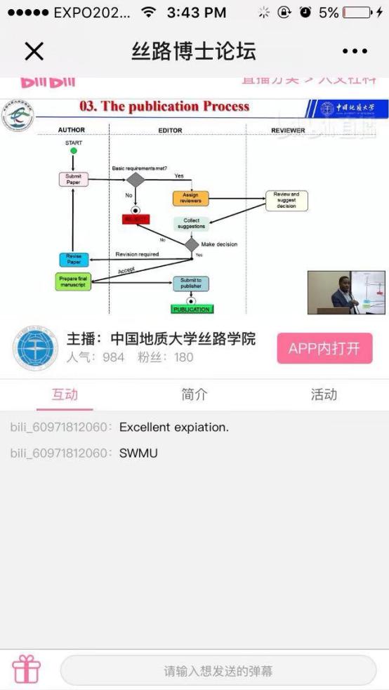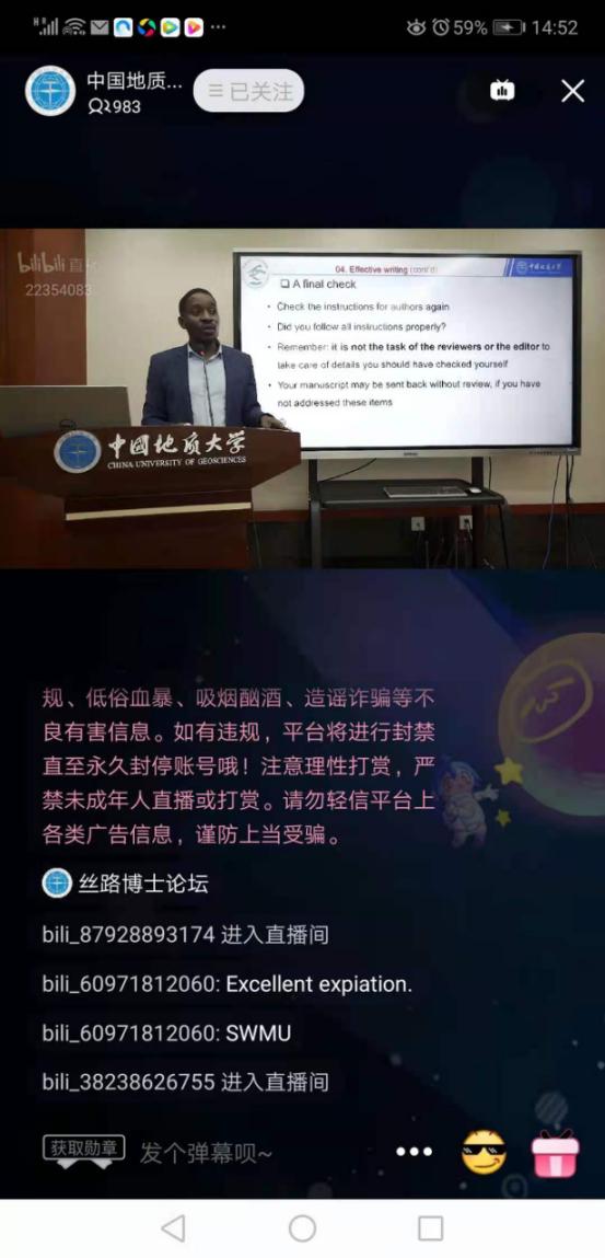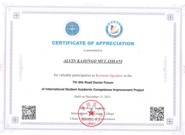 (通讯员 赵阳平 摄影 贾力)12月15日,2021年第七期丝路博士论坛由坦桑尼亚籍资源学院博士研究生ALVIN KAJONGO MULASHANI (中文名:穆拉沙),喀麦隆籍康亦灵主持,穆拉沙以《 Easing Academic Paper Writing and Publication Process (My experience)》为主题做论坛,线下20余名硕博研究生在丝绸之路学院会议室参加讲座,近千人在境内外参加线上讲座。