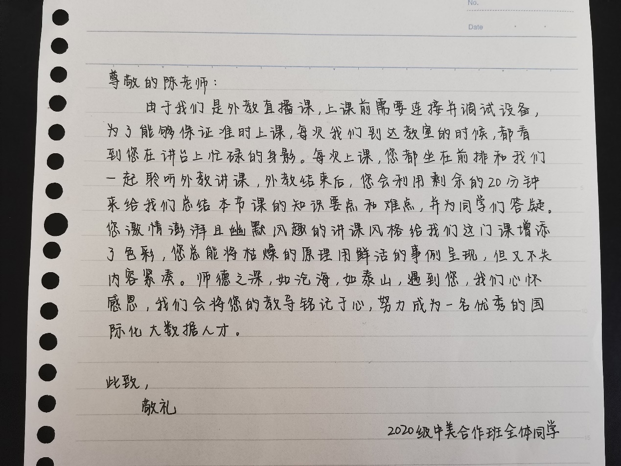 在中美两方教师的共同努力之下,中美合作班的学生已经顺利完成了2020-2021学年的课程,其中19G201班第一学期班级平均学分绩点位列年级第一。天涯海角有尽处,只有师恩无穷期。同学们明白自己的优异成绩离不开老师们的谆谆教诲,对本学年教授专业课程的老师们表示由衷的感谢。