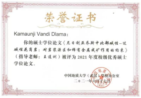 (学生记者:胡芯蕊)他是我校2021级地球科学学院地质学专业博士研究生,硕士期间学业表现优异,GPA达到了3.92,已公开发表2篇SCI论文。其中一篇是以第一作者身份发表的由我校认定期刊分类T2级别的SCI论文。他是尼日利亚籍硕士研究生KAMAUNJI VANDI DLAMA(中文名:万迪)。今年6月,他顺利通过硕士论文答辩,被授予理学硕士学位,并且荣获“2021年优秀硕士学位论文”的表彰。经过四年的求学生涯,中国已成为了万迪的第二故乡。
