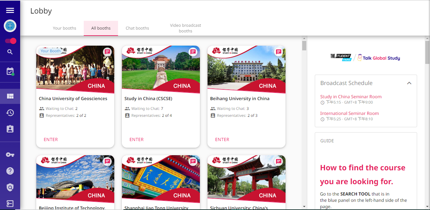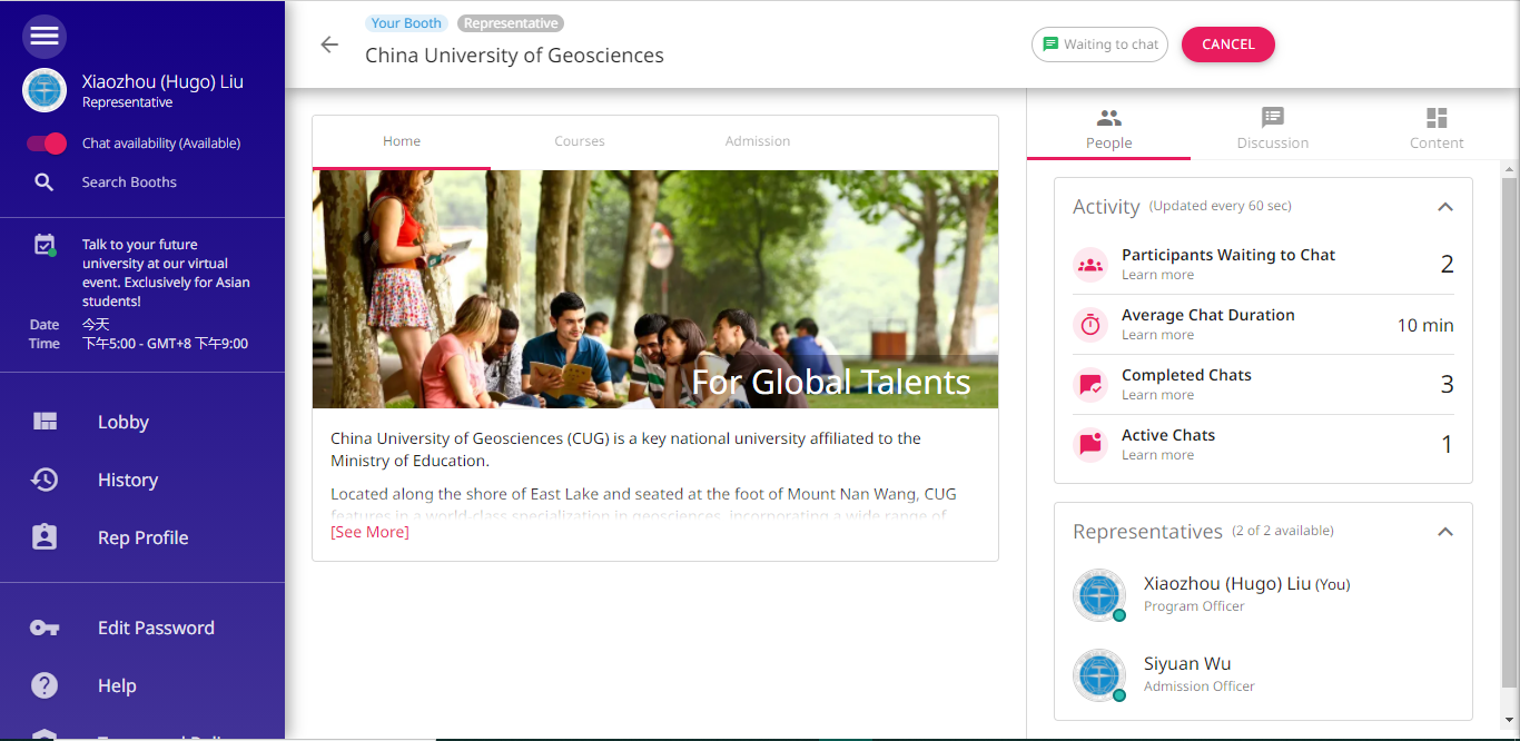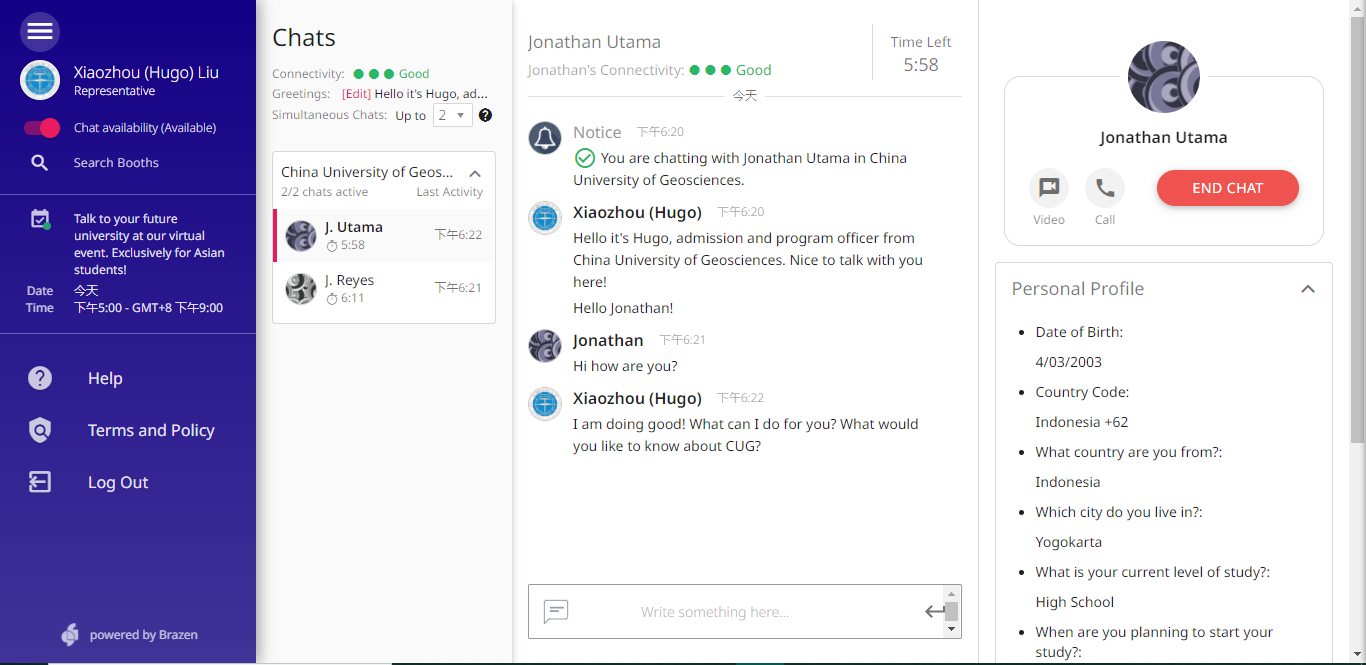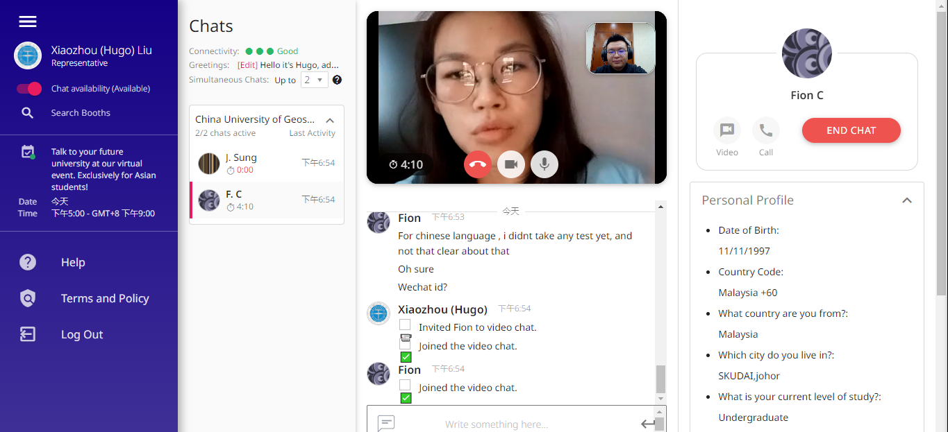此次线上教育展于北京时间下午5:00正式开始,时长4小时,采用全球直播、即时通讯、网络会议与“云论坛”相结合的方式,以“同你的未来中国高校对话”为主题,向亚洲地区的海外参展学生进行了广泛宣传。线上参展期间,来自我校英国威廉集团招生办公室的两名老师组成代表团,以“云宣讲”形式向来自全球的学生介绍了我校的基础办学科研实力、国际学生招生政策和来华留学培养成果,并向外国留学生提供一对一招生线上咨询服务累计90余人次,收获报名我校意向学生60余名,宣传效果良好。