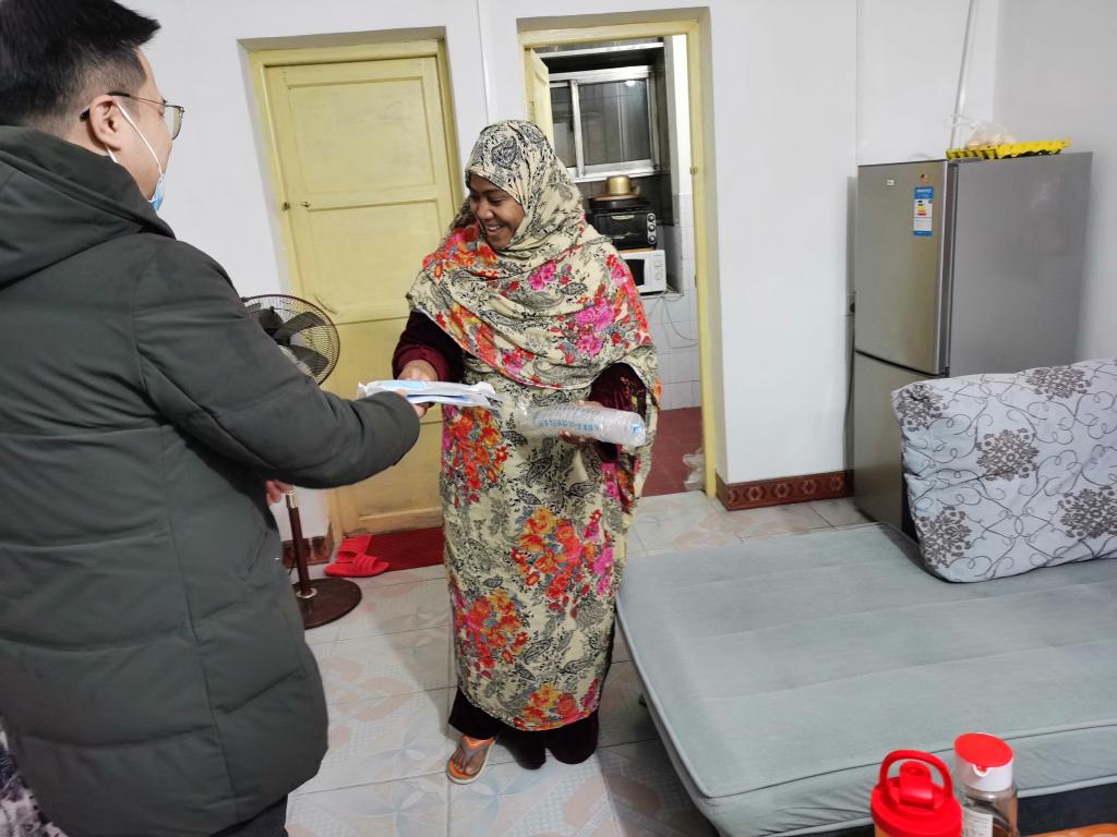 每到一处,两位老师都会亲自送上口罩等防疫物资并亲切询问校外国际学生的生活状况,叮嘱学生做好寒假期间自身防护,刻苦学习,专注科研,早日顺利完成在中国的留学任务,把所学应用到工作中,服务各自国家的经济社会发展事业。