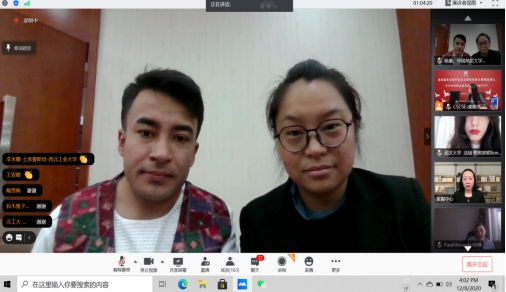 国际学生事务办公室赵阳平老师和各位同学分享了我校与“我与中国美丽邂逅”大赛的四年缘分,并讲述了在2020年这个特殊的一年,在汉国际学生和老师们的经历,老师们无私的付出以及同学们的配合与支持,正是千千万万武汉人在疫情来临时的真实写照,让在场所有人体会到了爱与奉献无国界。