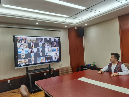 一等奖获得者阿富汗籍杨康在学院会议室参加腾讯会议