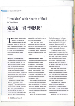 《特别关注》英文版“2020湖北抗击新冠肺炎疫情专辑(III)——《携手同心的战疫》刊登了三篇关于我校国际师生的抗疫故事。其中,《这里有一群“钢铁侠”》介绍了“钢铁侠”志愿队疫情期间和英国威廉集团、住宿服务中心员工共同抗疫的故事;《在中国朋友家里宅着》讲述了我校坦桑尼亚籍珍珍因疫情滞留在黄石中国朋友家庭的故事;《巴基斯坦留学生韩博:做点特别的事来表达对武汉的爱》讲述了韩博篆刻“武汉加油”,做中巴友谊践行者的故事。