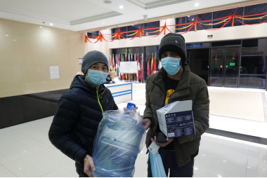 随着疫情防控进入了关键阶段,2月16日起,学校食堂窗口关闭,仅提供统一订餐服务。为了保障学生用餐,罗金刚负责每日与学校后勤对接订餐工作,前一天收集好订餐信息,第二天和志愿者一道将每餐饭送到学生房间。2月17日,在许峰老师的联系下,湖北省荆门市漳河新区双喜街道谭店村向中国地质大学(武汉)的国际学生捐赠了近8000斤新鲜蔬菜。这次,罗金刚再次参与了物资的搬运和分装工作,和许峰老师、罗文旭老师一起,为疫情期间的国际学生送去了最温暖的慰问、最贴心的礼物。