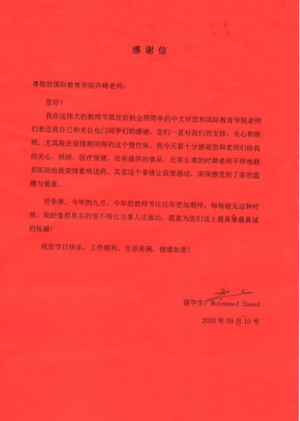 赛义德听朋友说粉色的玫瑰花象征友谊,百合花象征对老师的尊敬,所以他选择这两种花作为中国教师节的礼物送给老师们。在感谢信中,赛义德说在教师节这个特别的日子,他比老师们还激动,由于学中文的时间不长,他不会用华丽的语言感谢老师,只会用简单的中文送上自己最真挚真诚的祝福,祝老师们节日快乐,工作顺利,工作美满,健康如意!