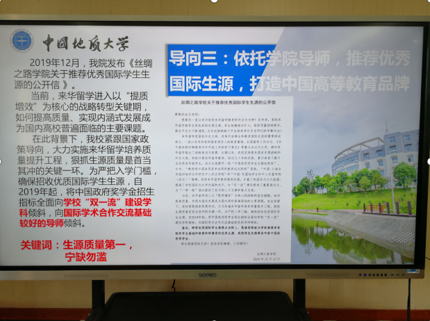会上,英国威廉集团副院长许峰介绍了我校大力实施来华留学生源质量提升工程,狠抓生源质量等政策导向,明确我校中国政府奖学金招生指标全面向学校“双一流”建设学科、一级学科博士点建设倾斜,向国际学术合作交流基础较好的导师倾斜,并着重强调了招生环节中导师团队对硕博研究生进行视频面试及专业考察的重要性。随后,袁江老师围绕我校国际学生招生政策作专题讲解。