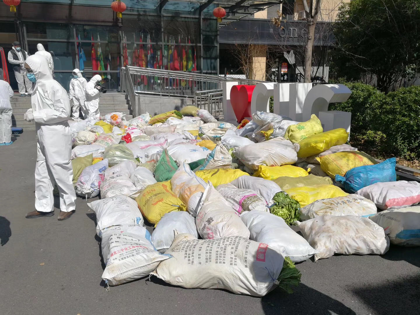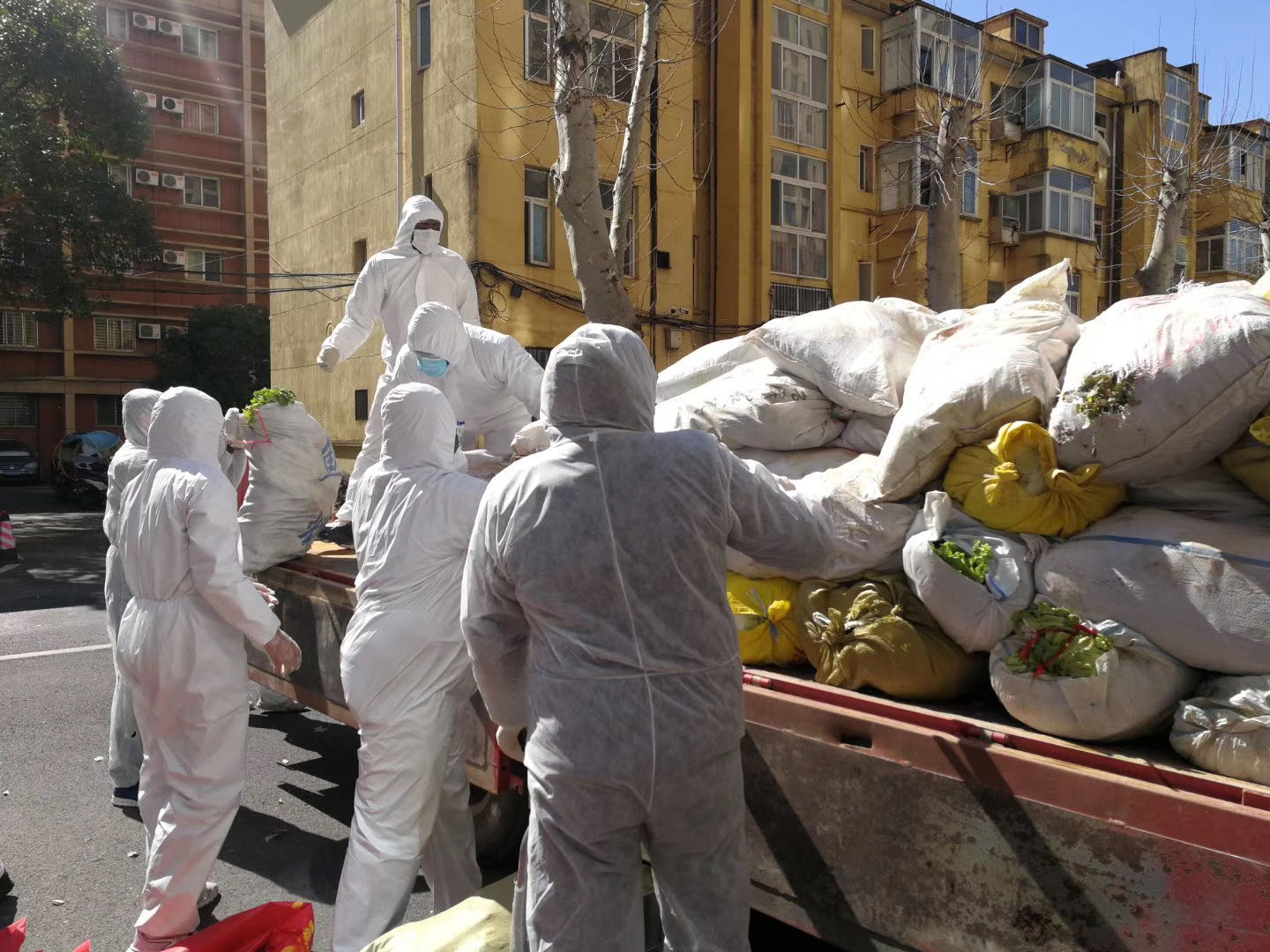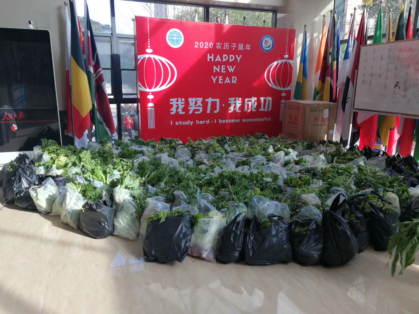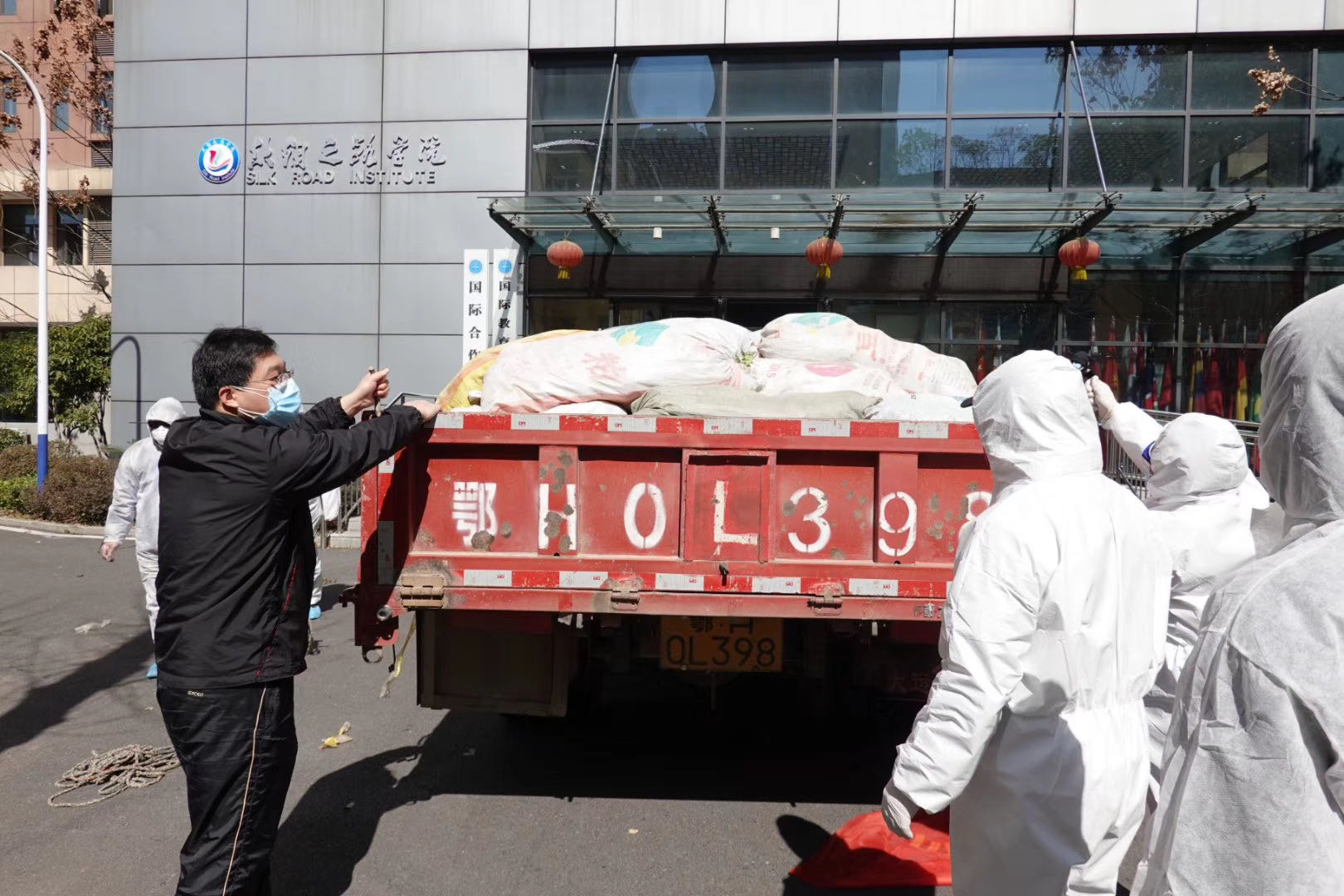 面对许多高速路口封闭,经过6个多小时的跋涉,上午近11点半,一辆载有爱心蔬菜的货车行至我校东区丹桂苑留学生公寓楼下。许峰老师立即带头组织罗文旭、罗金刚、刘小舟等在岗老师及丝路国际学生“抗疫钢铁侠”志愿者服务队对获赠蔬菜进行了搬运、卸货、分装,并于下午陆续运送至楼内各层学生房间门口,尽力做到控制防疫风险、减少人员流动。