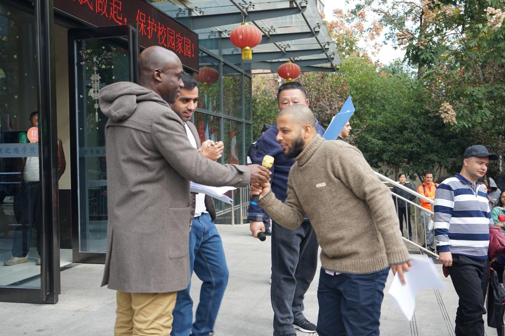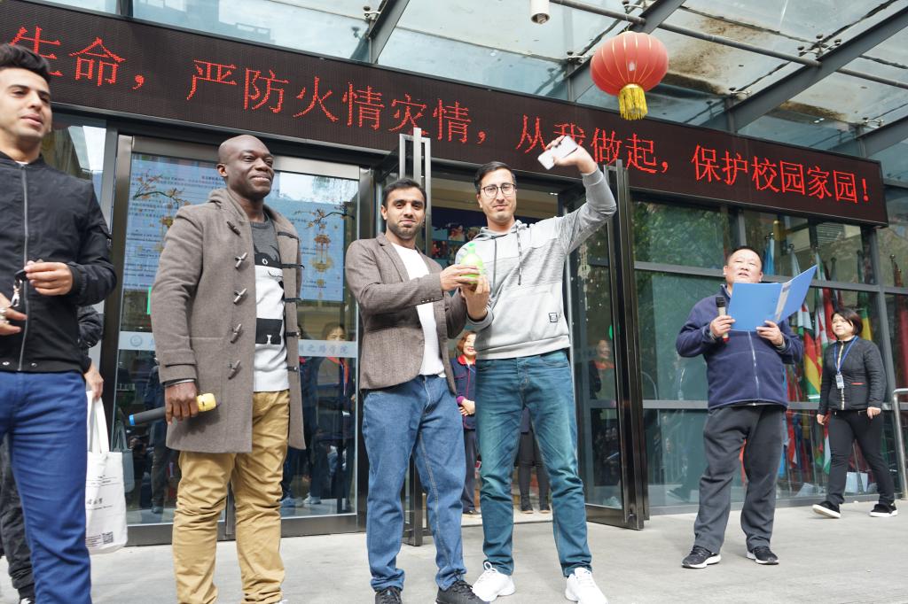 随后,为了调动国际学生学习逃生知识的积极性,测试大家对这些知识的掌握程度,周科长发言完后,英国威廉集团还组织了有奖提问。第一位回答问题的是来自苏丹的女博士—Tansi,她很快迅速答对了如何防止烟雾中毒和窒息死亡的问题,获得了一份抽纸作为奖励;第二位答对问题的是来自坦桑尼亚的本科生Jennifer,她回答了应选择水平方向进行逃生的问题;后面还有几位来自巴基斯坦,约旦,尼泊尔的同学也就如何正确逃生做了正确回答,获得了抽纸,洗衣粉等奖励。