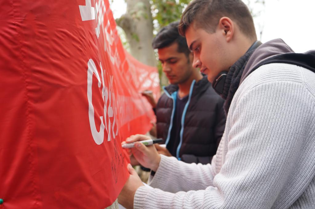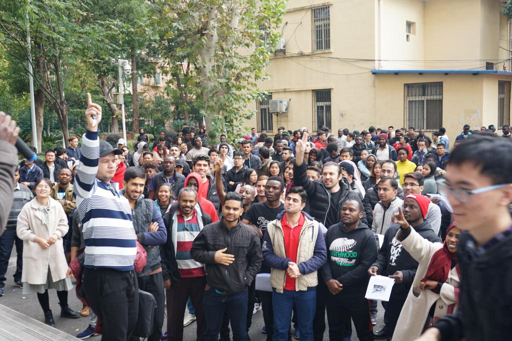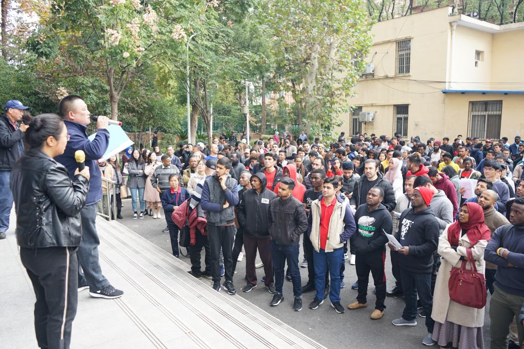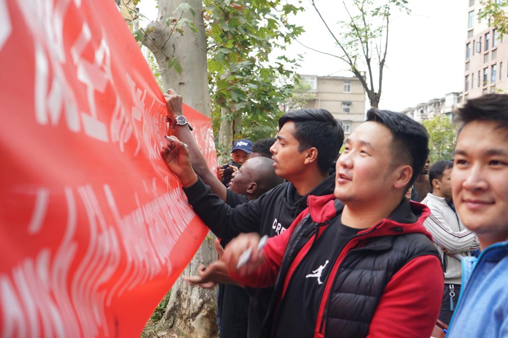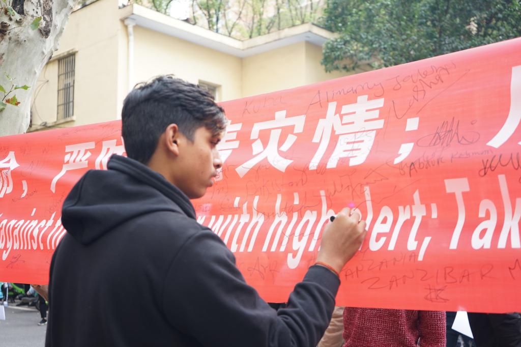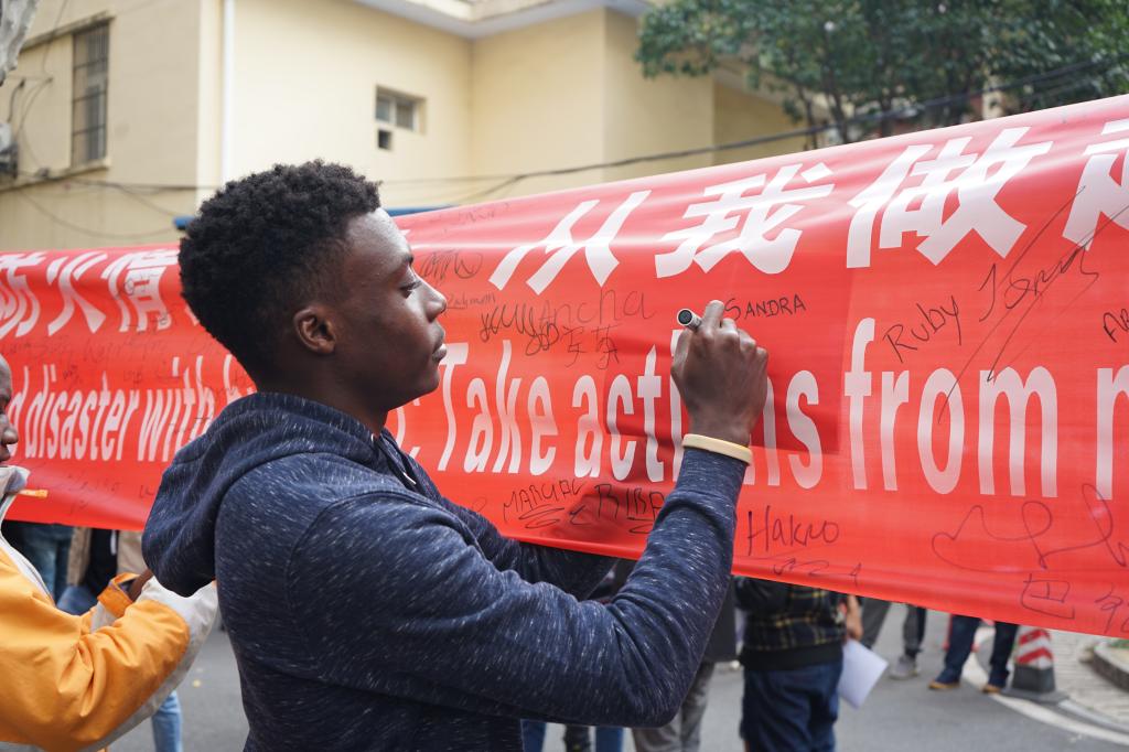 在火情逃生演练之后,国际学生有序地领取了紧急疏散逃生知识的手册,并排队在“珍视生命,严防火情灾情;从我做起,保护校园家园”的标语墙上签名,表明自己建设安全校园的决心。