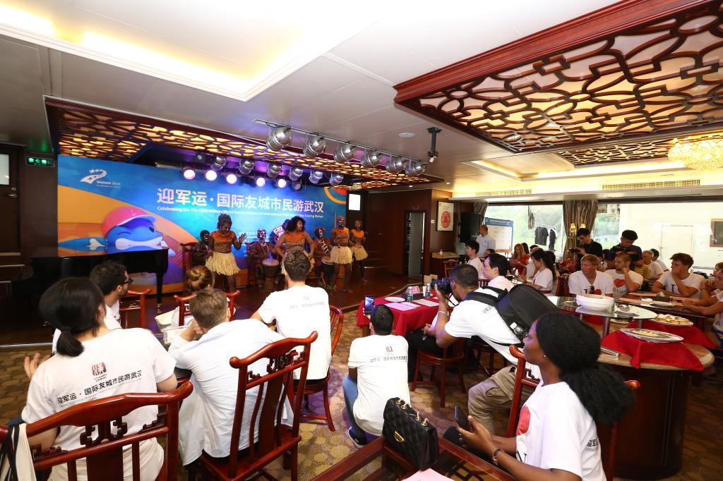 (通讯员:杨素 赵阳平)7月16日晚,由武汉市人民政府主办、武汉市人民政府外事办公室承办的“迎军运·国际友城市民游武汉-夜赏长江”活动在汉口江滩牡丹号游轮上举行。武汉国际友好城市代表、外国驻汉机构代表、在汉外国专家代表、外国留学生代表200余人欢聚一堂、赏江城美景、品楚风汉韵。我校来自贝宁、刚果(布)等国的20名国际学生和武汉芳华爱乐团等单位受邀参加游轮文艺演出。由我校选送的非洲鼓表演“非洲节拍”、男女生合唱“我相信你”、孟家拉独舞“春之歌”等节目收获友城市民的热烈掌声,许多观众上台跟随激情飞扬地鼓声一起欢快舞蹈,将晚会的气氛推向高潮。