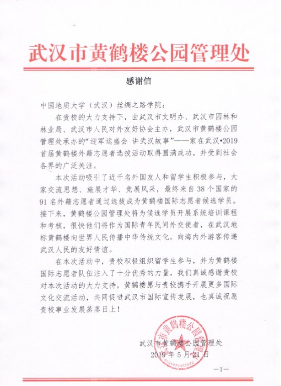 (通讯员:杨素)2019年6月10日,黄鹤楼公园管理处给我院发来感谢信,赞扬我校丝绸之路学院为“军运会国际志愿者”注入优秀力量。