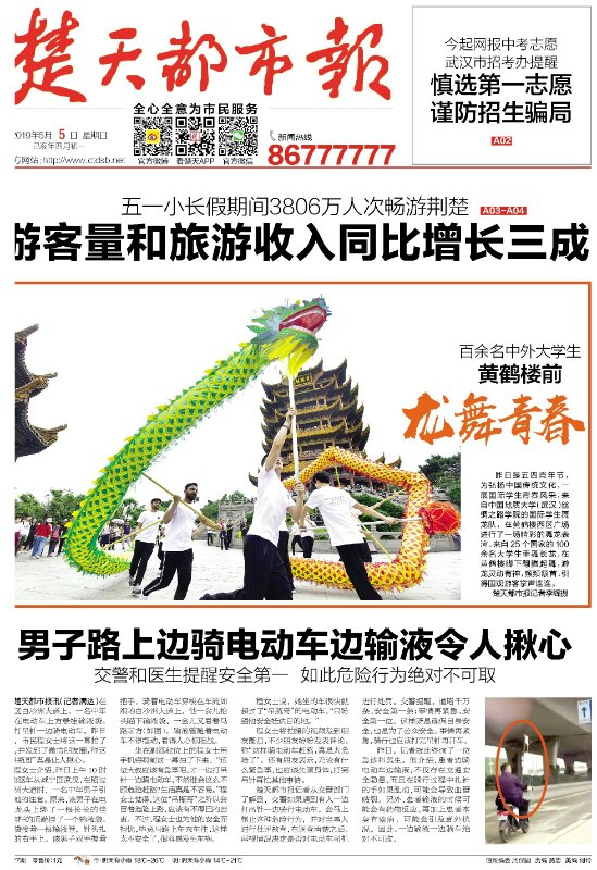五四青年节 我校国际学生舞龙队在黄鹤楼上演“龙舞青春”