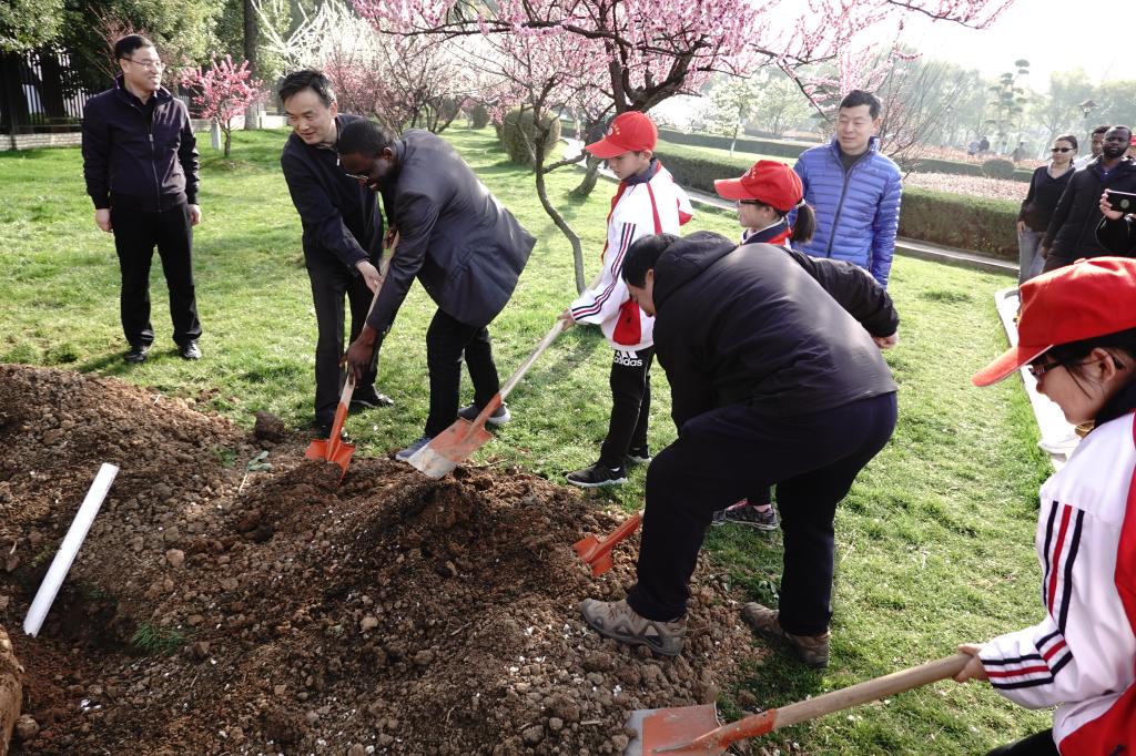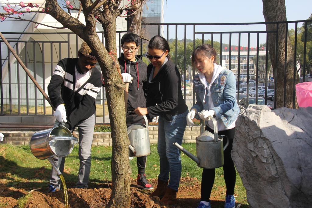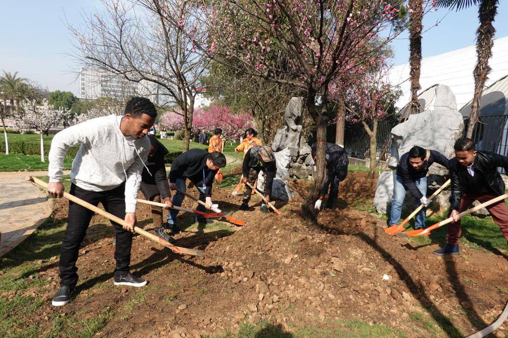 活动中,留学生和中国同学及老师一起合作植树,忙得不亦乐乎。来自尼日利亚的博士生IBRAHIM挥撬铲土,动作麻利,甚是专业,大家纷纷伸出大拇指,称赞其为种树能手。许多在场留学生都是第一次在中国参加植树活动,他们表示春天到了,万物复苏,阳光明媚,参加植树节活动既愉悦了身心,也让生活的环境变得更美好,希望绿色环保的理念像一粒种子播撒在世界的每一个角落。