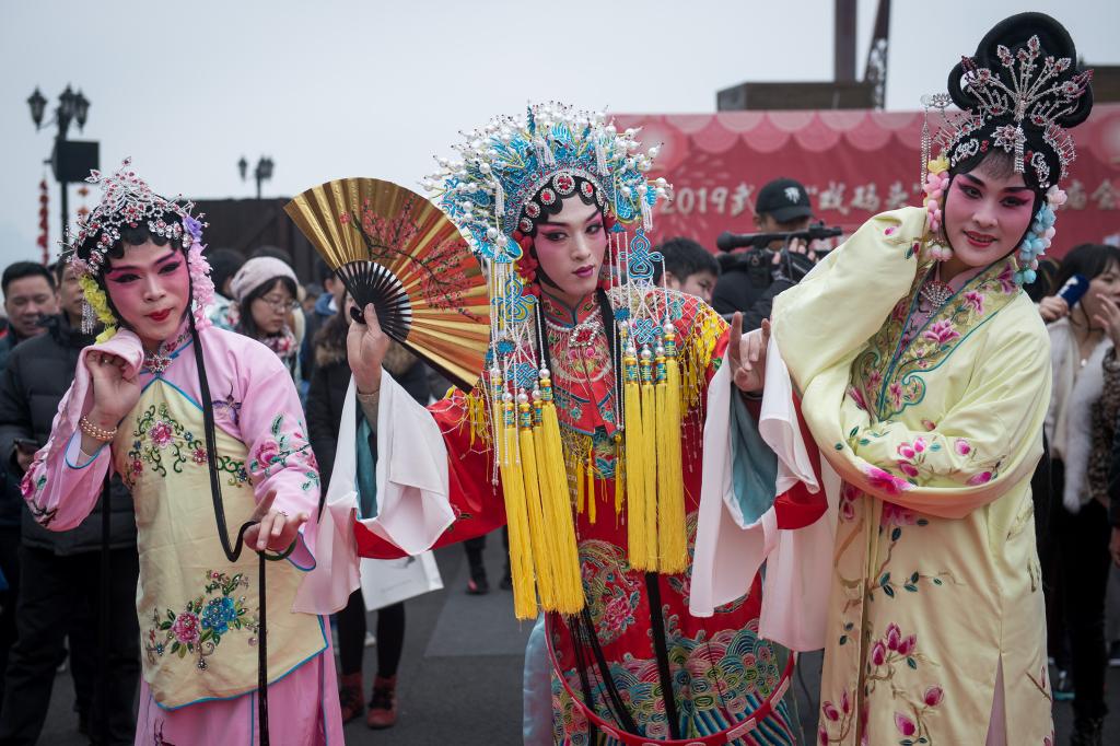 现场节目表演也洋溢着一派楚风汉韵。由汉剧、楚剧、黄梅戏片段组成的戏曲联唱赢得阵阵掌声,将表演推向高潮。还有划旱船、贝壳舞等民俗表演,热闹的锣鼓响起,彰显喜庆气息。