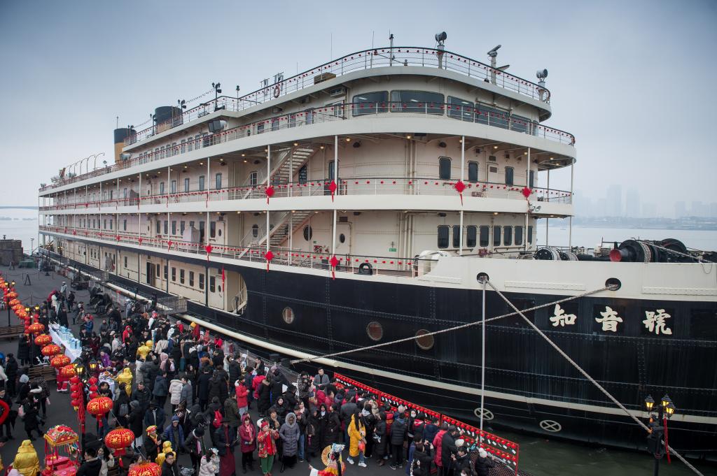 华中师范大学学生尹文静和几个同学拿起手机不停拍照,她说,“在‘知音号’上逛元宵民俗文化节,穿越百年时光,感受汉味年俗的韵味,还能欣赏长江夜景,这种混搭既时尚又新颖。今年军运会在武汉举行,期待这次国际体育盛会。”