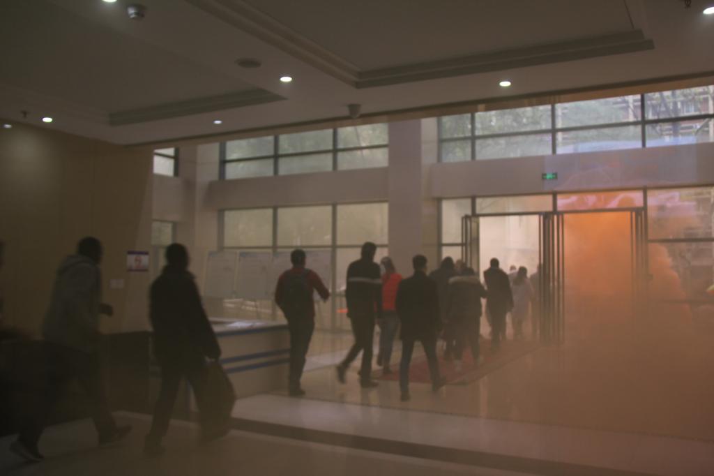 下午13:00,英国威廉集团楼前突然浓烟滚滚、烟雾弥漫。此时,消防疏散的警报声响起。紧接着,英国威廉集团的学生在老师的带领下,拿出平时备用的小毛巾,迅速地用矿泉水浸湿并捂住口鼻,有序地穿过大厅,在丹桂苑楼前迅速集合,整个疏散过程只用了不到10分钟的时间。集合完毕后,所有学生移步迎宾楼听取消防安全讲座。