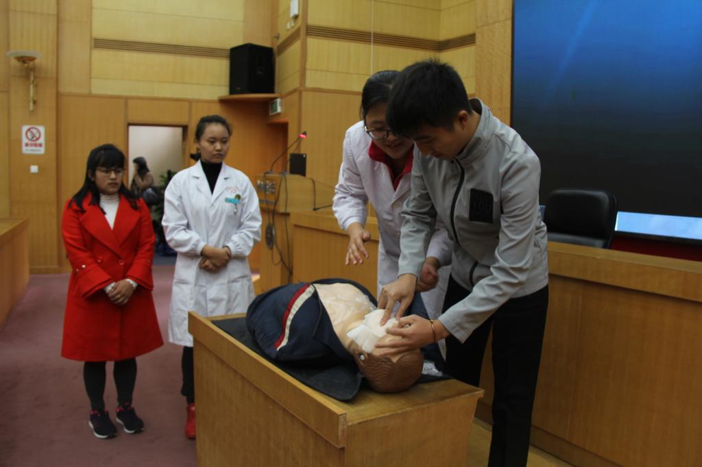 为了让学生初步掌握自救互救知识,提高自救互救技能。英国威廉集团师生在我校迎宾楼报告厅听取急救知识与高层逃生的消防安全讲座。首先,由我校校医院刘医生讲解了心肺复苏、创伤救护、排除气道异物等基本技能,并进行了实践操作方面的培训,培训过程中邀请同学们模拟了心脏复苏操作,大家热情高涨,边记边听,表现出了极大的兴趣。通过此次培训,同学们学到了许多专业的现场急救知识,掌握了自救互救的基本知识与技能,增强了自我保护意识。