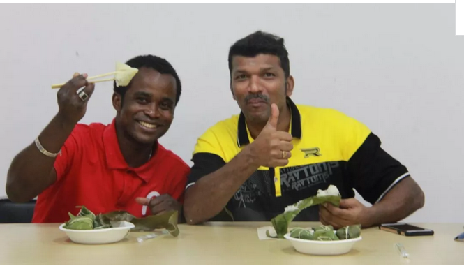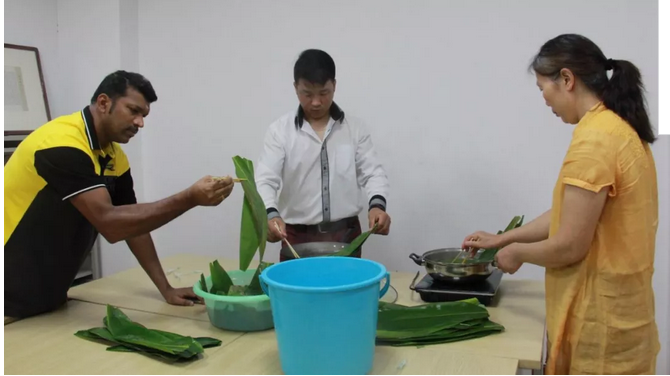 雪白的糯米、油绿的粽叶、五彩的棉线,还有各色馅料,在老教师们的巧手下变成了一个个棱角分明、精致饱满的粽子。国际学生在老师的指导下,依葫芦画瓢,顺利地完成了自己人生中的第一枚粽子。“说起端午节,还得从战国时期的爱国诗人屈说起……”,在包粽子之余,老教师们向国际学生们讲起了端午节的故事。屈原投江、赛龙舟、悬艾叶、佩香囊……一个个故事和习俗令同学们听得入神,在与老师的交流和包粽子的体验中领会着端午节的意义。期间,巴基斯坦1班学生给师生演唱了一首《三字经》,同学们用歌声表达了对中国文化的喜爱,退休老师们对我校留学生精彩的表演给与阵阵掌声。最后,英国威廉集团副院长张立军与留学生们一同品尝了大家的“作品”,并为同学们送上了端午节的祝福。
