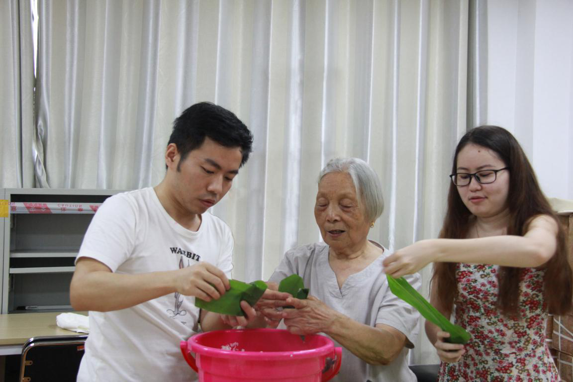 6月15日,丹桂苑留学生公寓一楼飘散着阵阵粽叶的清香,学校退休教师在桌子边忙碌着,而他们新收的“弟子”——我校来自10个国家的20几名国际学生则在一旁对包粽子这门中国传统手艺跃跃欲试。