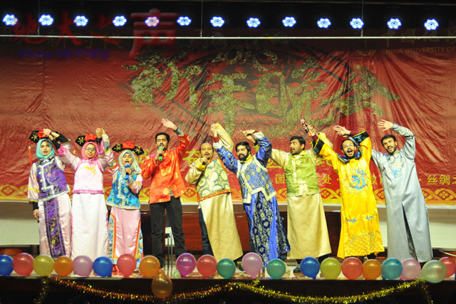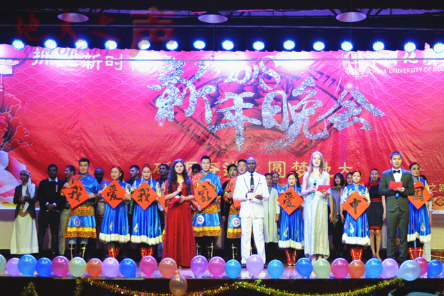 开场一首《丝路情•共建桥》使整个晚会沸腾起来,热情的非洲鼓敲出浓浓的年味儿,激情的说唱更展示了留学生们深深的武汉情、中国梦,最后一句“我爱中国”更是唱出留学生的心声。蒙古舞《天空的旋律》跳出了蒙古汉子的柔情,舞出了蒙古姑娘的甜美。欧亚非三个洲别的学生用三句半讲述了他们的《留学生活》,表达了留学生们对地大的深情厚爱。来自泰国的情歌王子张明诚和他的小伙伴们,给大家带来了歌舞情景剧《把汉语唱给你听》,最后的歌词改编更是把汉语学习生活表达的淋漓尽致,将现场气氛推向高潮,现场掌声不断。晚会在合唱《国家》中圆满落幕。