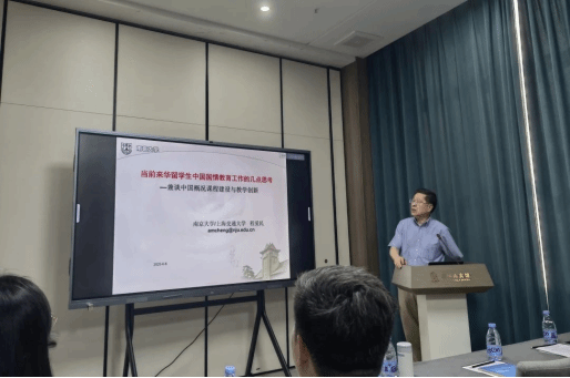 论坛伊始,南京大学博士生导师、上海交通大学特聘访问教授程爱民教授以《当前来华留学生中国国情教育工作的几点思考——兼谈中国概况课程建设与教学创新》为题,作了主旨报告。程教授深入分析了当前来华留学生国情教育面临的挑战,指出国情教育是帮助国际学生深入了解中国、增进对中国认知的重要途径。程教授还分享了其在“中国概况”课程建设方面的经验,提出要构建模块化、层次化的课程体系,并积极运用现代信息技术手段,提升课程的教学效果和吸引力。