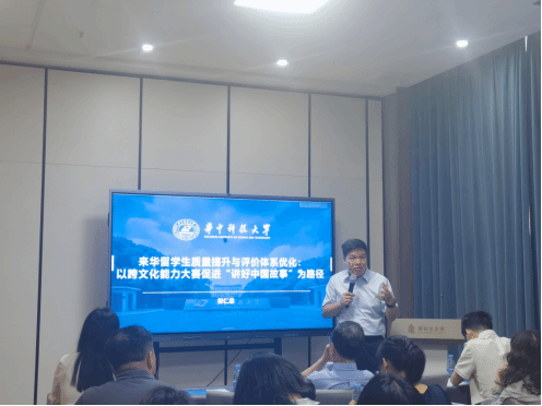 随后,华中科技大学彭仁忠教授作了题为《来华留学生质量提升与评价体系优化:以跨文化能力大赛促进“讲好中国故事”为路径》的报告。彭教授指出,跨文化能力是国际学生必备的核心素养,跨文化能力大赛是提升国际学生跨文化能力、促进中外文化交流的有效平台。他详细介绍了跨文化能力大赛的赛事设计、组织流程和评价体系,强调大赛要以“讲好中国故事”为主线,引导国际学生深入学习中国文化,增强跨文化理解和沟通能力。彭教授还分享了往届大赛的优秀案例,展示了大赛在促进国际学生跨文化交流方面取得的积极成效。