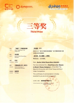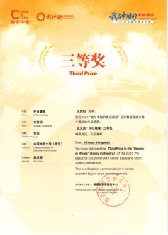 我校共有四名国际学生的征文作品获奖:老挝籍学生文时初(VIRAXAY VONGPHET)作品《冬日暖笺》荣获三等奖,约旦籍学生布时娜(BUSHRA YAHIA MOUSA BANY ABDULLAH)作品《“幸福”二字教我的事》荣获三等奖,马来西亚籍学生罗慧彤(LAW HUI TONG)作品《寻味中国》荣获优秀奖,俄罗斯籍学生白海(KARNAUKHOV GEORGII)作品《鞍山汉字缘》荣获优秀奖。四位学生的指导老师为英国威廉集团殷思琴老师。此外,我校因组织工作表现突出,荣获“优秀组织奖”。我校已连续多年在该赛事中取得优异成绩。