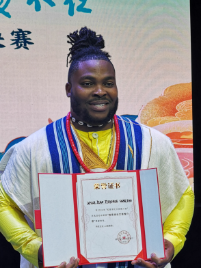 王强是我校经济管理学院博士研究生,他来自贝宁的音乐世家,从小在音乐中表现出较高天分,尤其擅长非洲鼓和萨克斯等乐器的演奏。此外,受家庭影响,王强特别热爱中国传统文化,经常参加公益性的社会文化活动,向世界讲述自己眼中真实的中国。此次王强参选的作品为《汉阳门花园》,歌曲通过与非洲鼓鼓点的轻柔结合被进行全新演绎,多维度展现了外国友人对武汉历史与文化的认同与热爱并深受观众喜爱。