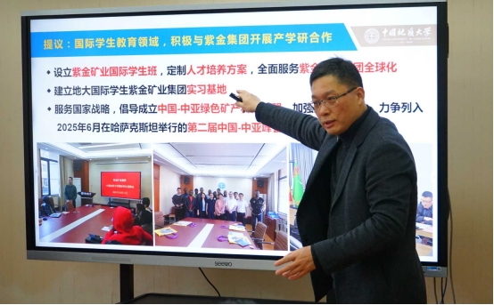 杜呈祥总经理介绍了紫金矿业的海外业务、分布国家及企业对本土化人才的需求。他对双方联合培养国际学生的方向表示肯定,提议在有意向去紫金矿业集团就业的地大国际学生中选拔优秀学生,并设立滚动制紫金国际学生班。