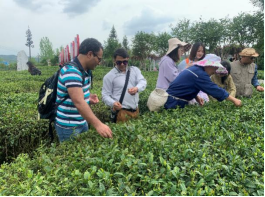 英山县作为大别山腹地,不仅承载着深厚的红色历史文化底蕴,同时拥有独特的自然风光。下午,学生们乘坐大巴继续前往英山县乌云山茶叶公园,在梯田茶海中亲身体验了茶叶的采摘和制作过程,在一芽一叶间品味着云雾茶的清甜。活动过程中,留学生们与当地茶农进行了深入的交流,了解了他们的生活方式和茶文化习俗。这种互动不仅增进了中外人民之间的友谊,也推动了不同文化之间的相互理解和尊重。