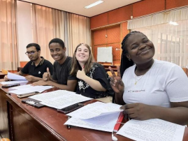 预科全体老师与同学们亲切交流,并按照班级进行了别开生面的班会活动。老师们为学生们发放了教材,寄语同学们在地大学有所成。拿到书的同学们都在认真地研究课本,分享书里有趣的地方,并希望能尽快开始这一年的学习。来自保加利亚的预科生乔清越激动地说:“我希望在新学期能努力学习,收获更多宝贵的知识,在地大这个美丽的家园里生活,让地大成为梦想的新起点。”