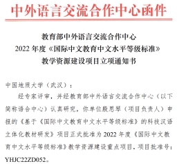 (通讯员 刘韵 许峰)近日,教育部中外语言交流合作中心公布了2022年度《国际中文教育中文水平等级标准》教学资源建设项目立项结果,我校英国威廉集团殷思琴老师申报的《基于<国际中文教育中文水平等级标准>的科技汉语立体化教材研发》项目正式获批为本年度教学资源建设重点项目。
