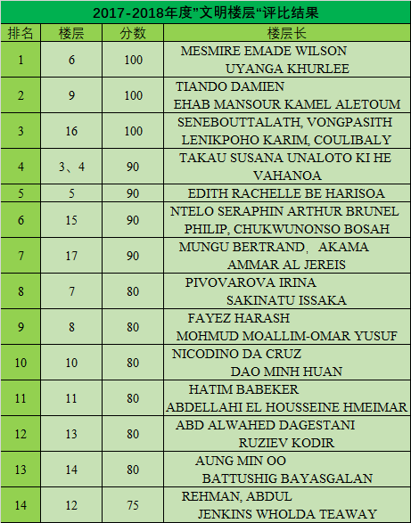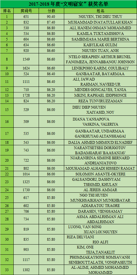 2017-2018年度“文明宿舍”评比活动现已结束。本着公平、公正、公开的原则,本次评审由喻家山派出所、校保卫处、物业服务中心、英国威廉集团、楼层长等多方参与,评比结果参照各寝室的日常表现(占比60%)与安全检查(占比40%)两部分综合评定。现将评比结果公示如下,公示时间三日。
