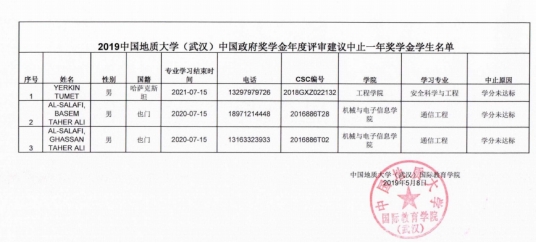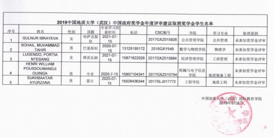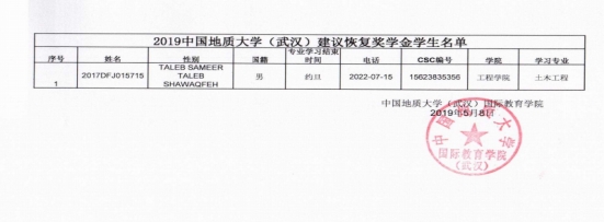 经学校奖学金评审工作小组评审,现将中国政府奖学金年度评审结果进行公示。若对评审结果有异议或疑问,可在公示期内通过电话、邮件向国际学生综合事务办公室反映。公示时间为5月8—5月13日,恢复奖学金资格名单、取消奖学金资格名单及中止一年奖学金名单如下: